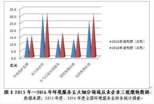 2016年企業(yè)繳納的營業(yè)稅金及附加、管理費(fèi)用中的稅金、應(yīng)交增值稅之和同比增長18.5%,達(dá)125.7億元。五大細(xì)分領(lǐng)域中,水污染治理、危險廢物治理企業(yè)分別以32.5億元、31.9億元位居五大細(xì)分領(lǐng)域三稅繳納額的前兩位,分別貢獻(xiàn)了三稅總額的25.8%和25.4%。固體廢物治理企業(yè)2016年繳納三稅總額同比增速最大,達(dá)37.0%,這可能歸因于2016年我國城鎮(zhèn)化的深入推進(jìn),帶動了固體廢物處理領(lǐng)域市場空間的不斷擴(kuò)大,以及該領(lǐng)域明顯提高的營業(yè)利潤率。