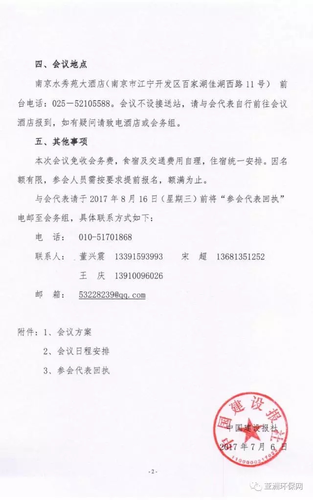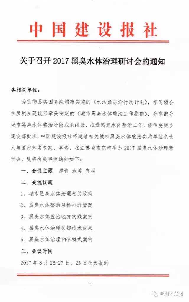 為貫徹落實(shí)國(guó)務(wù)院頒布實(shí)施的《水污染防治行動(dòng)計(jì)劃》,學(xué)習(xí)領(lǐng)會(huì)住房城鄉(xiāng)建設(shè)部與環(huán)境保護(hù)部共同制定的《城市黑臭水體整治工作指南》,分享部分地區(qū)城市黑臭水體整治階段成果經(jīng)驗(yàn),推進(jìn)黑臭水體整治工作,為此,經(jīng)住房城鄉(xiāng)建設(shè)部批準(zhǔn),中國(guó)建設(shè)報(bào)社主辦,邀請(qǐng)相關(guān)城市黑臭水體整治實(shí)施單位負(fù)責(zé)人與國(guó)內(nèi)知名專家、學(xué)者,在江蘇省南京市舉辦2017黑臭水體治理研討會(huì)。現(xiàn)將有關(guān)事宜函告如下: