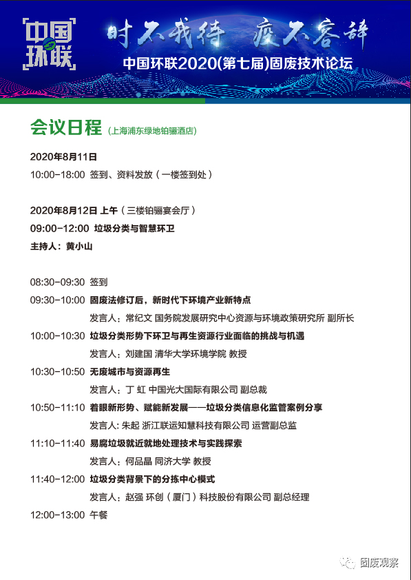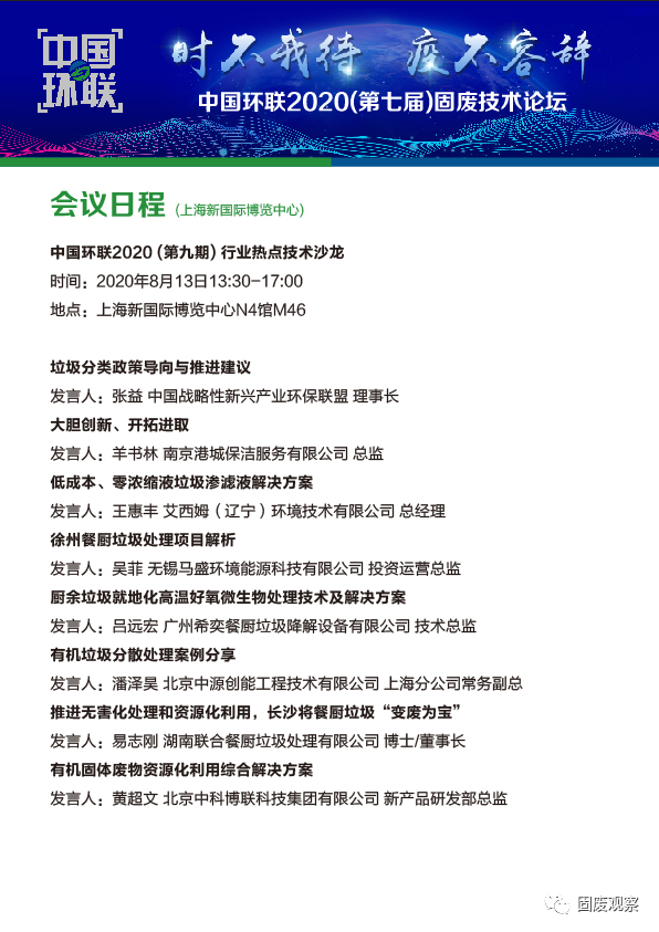 中國環(huán)聯(lián)2020(第七屆)固廢技術論壇定于2020年8月12-13日在上海市與第二十一屆中國環(huán)博會(2020年8月13-15日)背靠背召開。論壇將聚焦“疫情影響下垃圾焚燒處理潛在市場”、“垃圾分類新政策下行業(yè)特點”、“餐廚垃圾處理市場與短板”、“建筑垃圾資源化”、“固廢法修訂帶來行業(yè)新機遇”等熱點話題。我們邀請到常紀文、徐海云、劉建國、何品晶、張益、黃小山、徐進軍等資深專家,以及在垃圾分類、環(huán)衛(wèi)管理、固廢處理、無廢城市等領域的卓越企業(yè)老總等,一起解讀最新政策與行業(yè)機遇、分析市場趨勢與技術焦點、分享創(chuàng)新模式與經營理念,共同為“后疫情時代”的環(huán)境衛(wèi)生與生態(tài)環(huán)境建設獻計獻策。