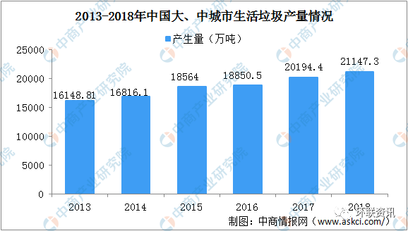 我國(guó)是人口大國(guó),也是垃圾產(chǎn)生大國(guó),且隨著經(jīng)濟(jì)穩(wěn)步發(fā)展、民眾生活消費(fèi)水平、城鎮(zhèn)化率不斷提高,生活垃圾產(chǎn)生量持續(xù)走高,2018年,全國(guó)200個(gè)大、中城市生活垃圾產(chǎn)生量21147.3萬噸。