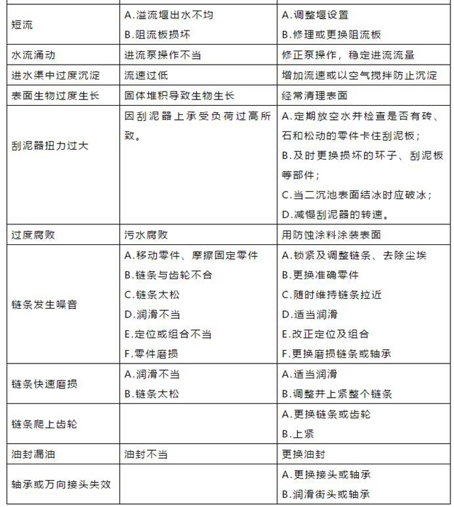 6、定期(一般每年一次)將二沉池放空檢修,重點檢查水下設(shè)備、管道、池底與設(shè)備的配合等是否出現(xiàn)異常,并根據(jù)具體情況進行修復(fù)。