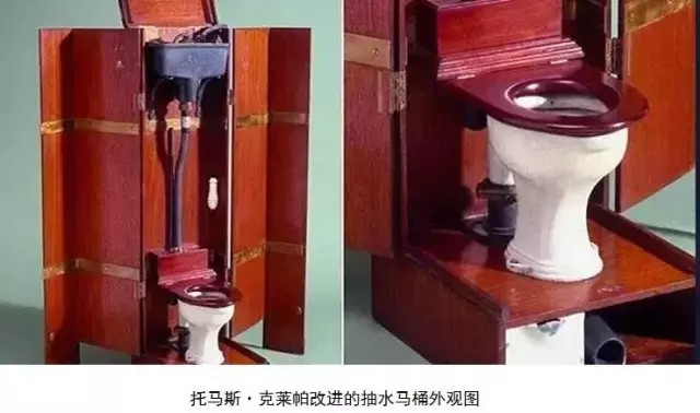 約翰·哈靈頓在1597年設(shè)計出了使用水沖的馬桶,是一個有水箱和沖水閥門的木制座位(如上圖)。這是歷史上第一個實用的抽水馬桶,水箱高高掛起,閥門可以放出水。這種馬桶可以用抽水的方式進行自動清潔,相比傳統(tǒng)的馬桶,要方便的多。