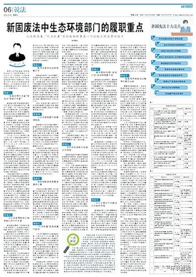 圖為中國環(huán)境報報2020年9月4日六版,對新固廢法中生態(tài)環(huán)境部門的履職重點進行了梳理和解讀。