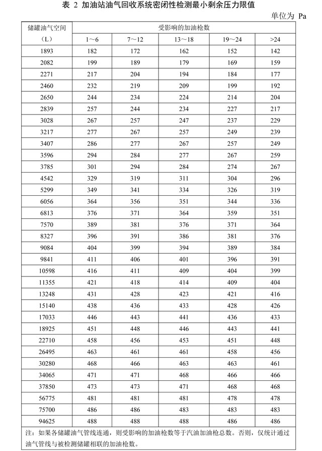 密閉性限值執(zhí)行GB20952標(biāo)準(zhǔn)規(guī)定,油氣回收系統(tǒng)密閉性壓力檢測(cè)值應(yīng)大于等于表2規(guī)定的最小剩余壓力限值。