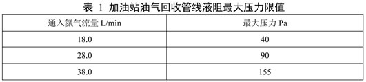 液阻限值執(zhí)行GB20952標(biāo)準(zhǔn)規(guī)定,加油油氣回收管線液阻檢測(cè)值應(yīng)小于表1規(guī)定的最大壓力限值。