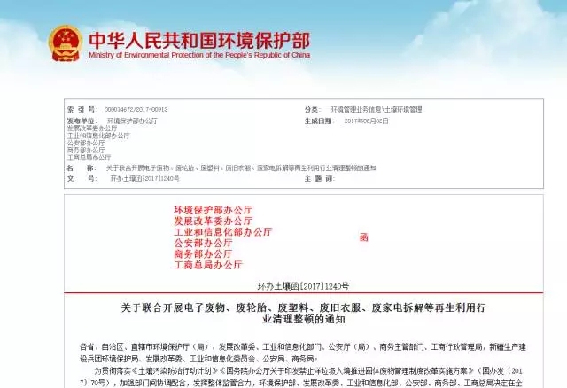 為貫徹落實(shí)《土壤污染防治行動(dòng)計(jì)劃》《國(guó)務(wù)院辦公廳關(guān)于印發(fā)禁止洋垃圾入境推進(jìn)固體廢物管理制度改革實(shí)施方案》(國(guó)辦發(fā)〔2017〕70號(hào)),加強(qiáng)部門間協(xié)調(diào)配合,發(fā)揮整體監(jiān)管合力,環(huán)境保護(hù)部、發(fā)展改革委、工業(yè)和信息化部、公安部、商務(wù)部、工商總局決定在全國(guó)范圍內(nèi)開(kāi)展電子廢物、廢輪胎、廢塑料、廢舊衣服、廢家電拆解等再生利用行業(yè)清理整頓。現(xiàn)將《電子廢物、廢輪胎、廢塑料、廢舊衣服、廢家電拆解等再生利用行業(yè)清理整頓工作方案》印發(fā)給你們,請(qǐng)結(jié)合本地實(shí)際,抓好貫徹落實(shí)。