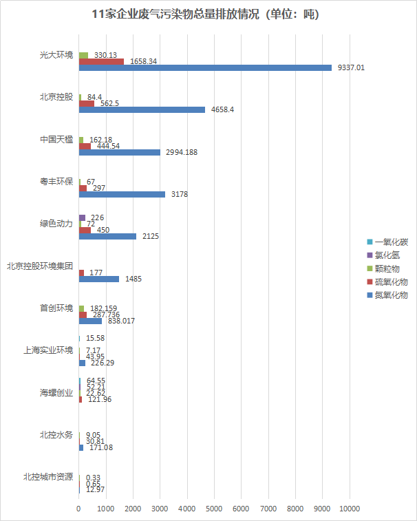雖然焚燒可以極大減少垃圾量,但伴隨而來的,也存在有廢氣污染的問題。通常,焚燒過程中的廢氣污染物有:氮氧化物、硫氧化物、顆粒物、氯化氫和一氧化碳。在已發(fā)布ESG報(bào)告的25家企業(yè)中,共有11家有披露廢氣污染物排放情況,披露率為44%,具體如下:
