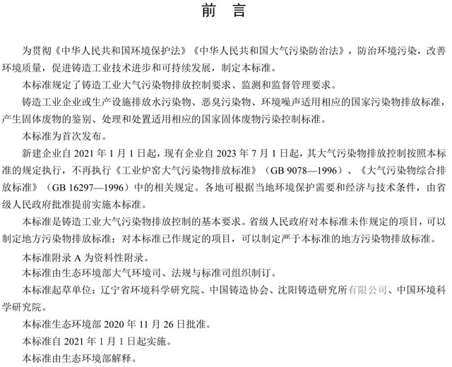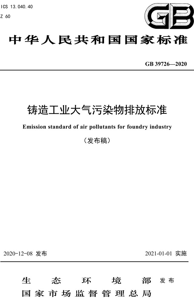 日前,生態(tài)環(huán)境部發(fā)布鑄造工業(yè)大氣污染物排放標準(GB 39726-2020)。詳情如下: