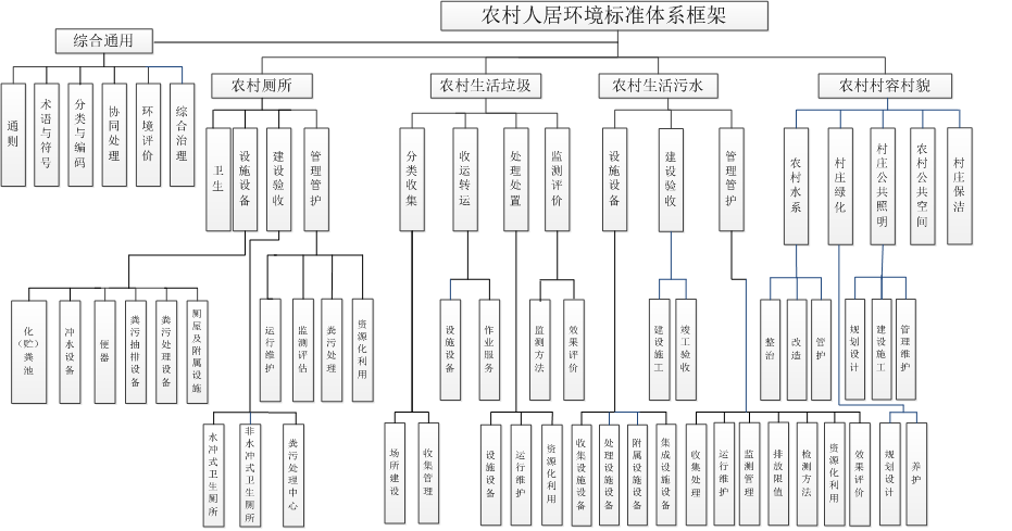 根據(jù)農(nóng)村人居環(huán)境發(fā)展現(xiàn)狀和實際需求,構(gòu)建內(nèi)容科學(xué)、結(jié)構(gòu)合理的農(nóng)村人居環(huán)境標(biāo)準(zhǔn)體系框架。體系分為三個層級,第一層級包括綜合通用、農(nóng)村廁所、農(nóng)村生活垃圾、農(nóng)村生活污水、農(nóng)村村容村貌標(biāo)準(zhǔn)子體系。第二層級由第一層級展開,包括6個綜合通用要素、4個農(nóng)村廁所要素、4個農(nóng)村生活垃圾要素、3個農(nóng)村生活污水要素、5個農(nóng)村村容村貌要素。第三層級由第二層級展開,對相應(yīng)標(biāo)準(zhǔn)要素作出進一步細(xì)化分類(如圖所示)。