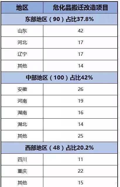 據(jù)了解,工信部、國家發(fā)改委等遴選出的238個?;钒徇w改造項目,按區(qū)域劃分,東部地區(qū)有90個,占項目總數(shù)的37.8%,中部地區(qū)有100個,占項目總數(shù)的42%;西部地區(qū)有48個,占項目總數(shù)的20.2%。