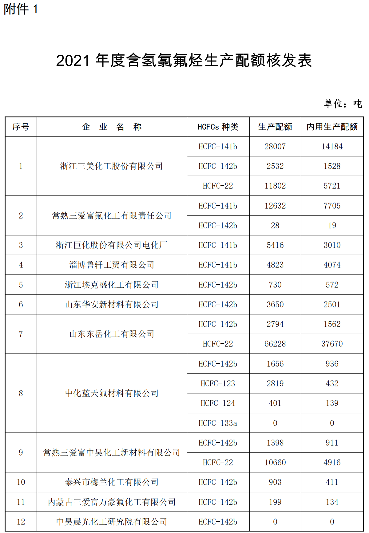附件:1.2021年度含氫氯氟烴生產(chǎn)配額核發(fā)表