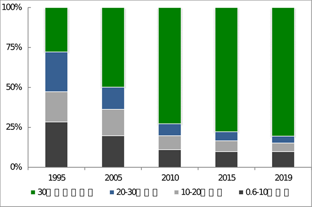 結(jié)構(gòu)調(diào)整成效明顯,資源能源利用效率逐步提升。按照相關(guān)政策要求,火電行業(yè)繼續(xù)加大結(jié)構(gòu)調(diào)整力度,提高資源能源利用效率。2019年共關(guān)停淘汰約2000萬千瓦火電小機組,30萬千瓦及以上機組裝機占比從2015年的77.8%提升至80.5%。行業(yè)平均供電煤耗從2015年的315克/千瓦時降至306.4克/千瓦時,平均發(fā)電水耗從2015年的1.40千克/千瓦時降至1.21千克/千瓦時。按全年發(fā)電量估算,行業(yè)煤炭消費量約占全國煤炭消費總量的49.8%,首次降至50%以下。