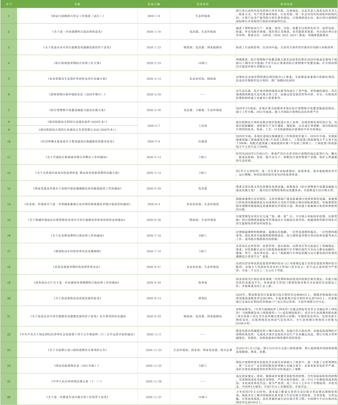 大方向抓好成果鞏固,小領(lǐng)域盯精細(xì)化管理,這已經(jīng)成為目前固體廢棄物處置管控的新形勢。既要讓固體廢棄物污染治理從科學(xué)謀劃做起,從統(tǒng)籌管理處著手,也要關(guān)注難點(diǎn)、痛點(diǎn)、主要矛盾點(diǎn)。針對“白色污染”,2020年元旦即發(fā)布《關(guān)于進(jìn)一步加強(qiáng)塑料污染治理的意見》。一年過半又再發(fā)《關(guān)于扎實(shí)推進(jìn)塑料污染治理工作的通知》,商務(wù)部還專門就“商務(wù)”領(lǐng)域塑料污染治理工作發(fā)布通知,可見重視程度。另,危險廢棄物也是2020年固體廢棄物污染治理領(lǐng)域的重中之重,尤其是醫(yī)療廢棄物處置。從廢舊輪胎利用、建筑垃圾減量、廢舊家電回收、畜禽養(yǎng)殖糞污還田、報廢機(jī)動車回收、農(nóng)藥包裝回收等“有的放矢”的法規(guī)來看,也越能體現(xiàn)“涉足領(lǐng)域愈微”這一點(diǎn),也間接表明“十三五”期間我國固廢管控向細(xì)微處滲透,處置能力增強(qiáng)伴隨管理模式轉(zhuǎn)變的顯著成效。
