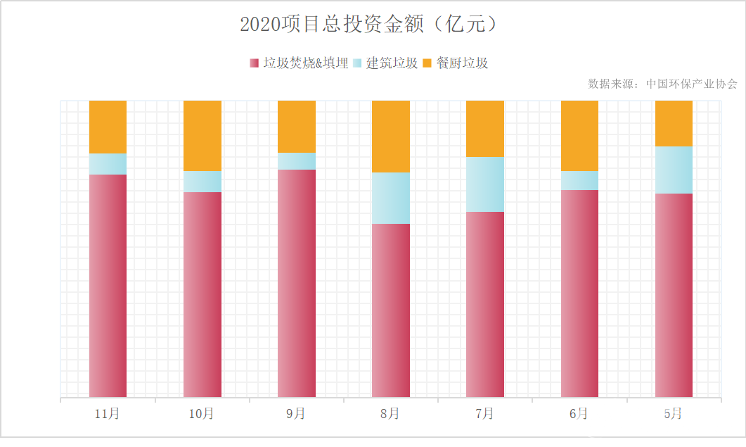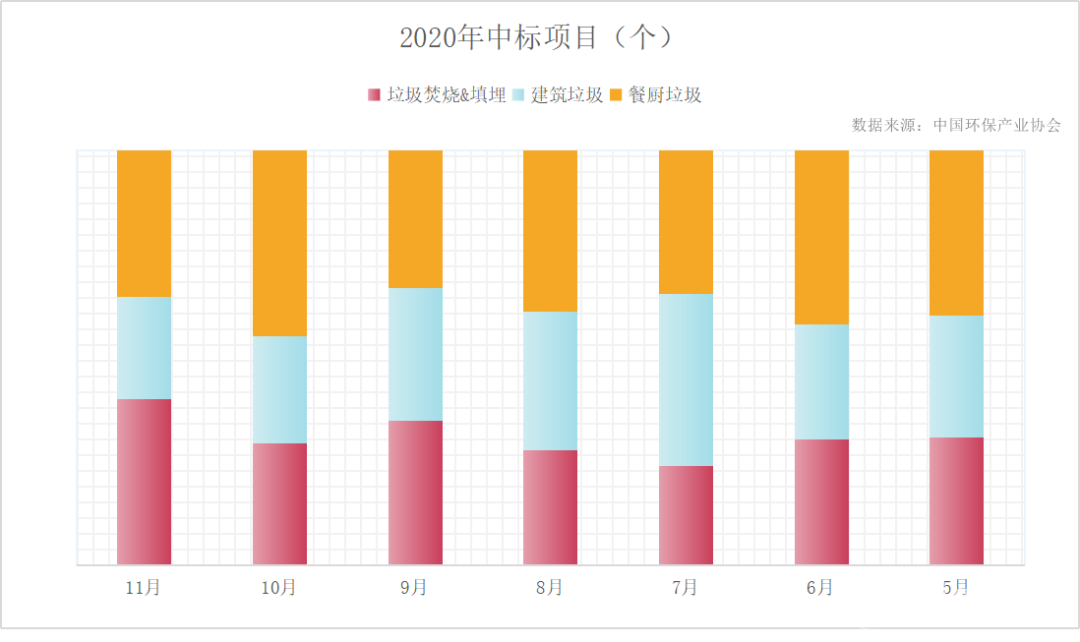 應(yīng)開展信息發(fā)布工作的環(huán)境保護(hù)重點(diǎn)城市和環(huán)境保護(hù)模范城市均已按照規(guī)定發(fā)布信息,統(tǒng)計(jì)數(shù)據(jù)差異源于自愿開展信息發(fā)布工作的城市數(shù)量。再來看2020年前11個月的細(xì)分領(lǐng)域數(shù)據(jù)——2020年前11個月,全國垃圾焚燒中標(biāo)項(xiàng)目共計(jì)311項(xiàng),總投資金額共計(jì)655.15億元;餐廚垃圾處理處置中標(biāo)項(xiàng)目共計(jì)361項(xiàng),總投資金額194.6億元;2020年5月到11月,全國建筑垃圾處理處置中標(biāo)項(xiàng)目共計(jì)213項(xiàng),總投資金額61.85億元。從中標(biāo)項(xiàng)目數(shù)量來看,垃圾焚燒和填埋、建筑垃圾、餐廚垃圾處理處置項(xiàng)目各有千秋,但是從總投資金額,以及單個項(xiàng)目平均投資金額來看,垃圾焚燒&填埋顯然遠(yuǎn)超后兩者。相較之下,建筑垃圾處理處置項(xiàng)目波動較大,餐廚垃圾處理處置項(xiàng)目中標(biāo)情況則較為平穩(wěn)。十九屆五中全會通過的《中共中央關(guān)于制定國民經(jīng)濟(jì)和社會發(fā)展第十四個五年規(guī)劃和二〇三五年遠(yuǎn)景目標(biāo)的建議》明確指出,到2035年,廣泛形成綠色生產(chǎn)生活方式,碳排放達(dá)峰后穩(wěn)中有降,生態(tài)環(huán)境根本好轉(zhuǎn),美麗中國建設(shè)目標(biāo)基本實(shí)現(xiàn)。