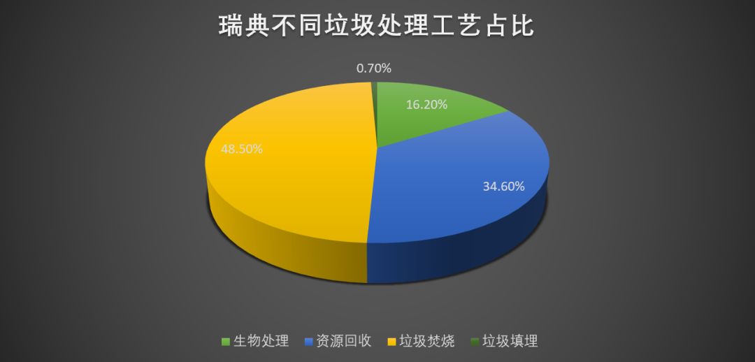 瑞典每年處理的生活垃圾大約在 466 萬噸,全國(guó)人均垃圾年產(chǎn)生量為 467 千克。在瑞典,幾乎所有的生活垃圾都被回收、加工和處理,或是作為能源使用。在瑞典的生活垃圾中,循環(huán)利用為 161.5 萬噸,占總量的 34.6% ;將有機(jī)垃圾變?yōu)槎逊?、沼氣或混合肥料的生物處理量?75.7 萬噸,占總量的 16.2% ;將垃圾轉(zhuǎn)化為熱能和電能的焚燒處理量為 226.3 萬噸,占總量的 48.5% ;沒有利用價(jià)值被填埋處理的為 3.1 萬噸,僅占總量的 0.7%。