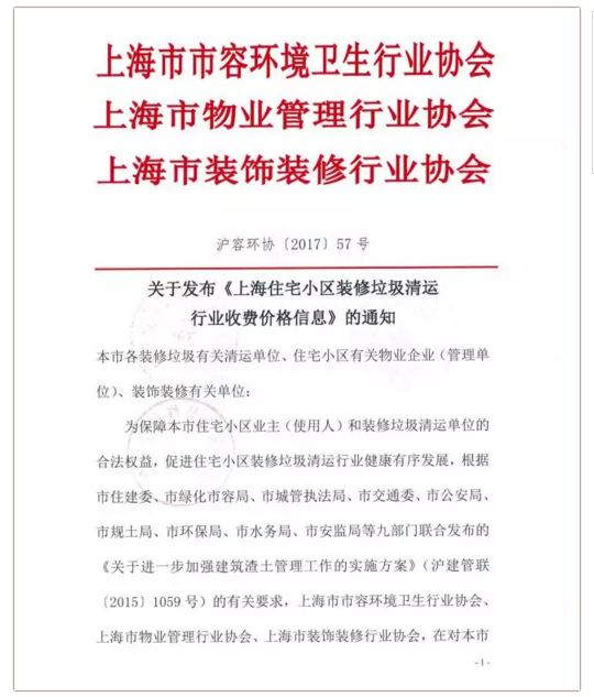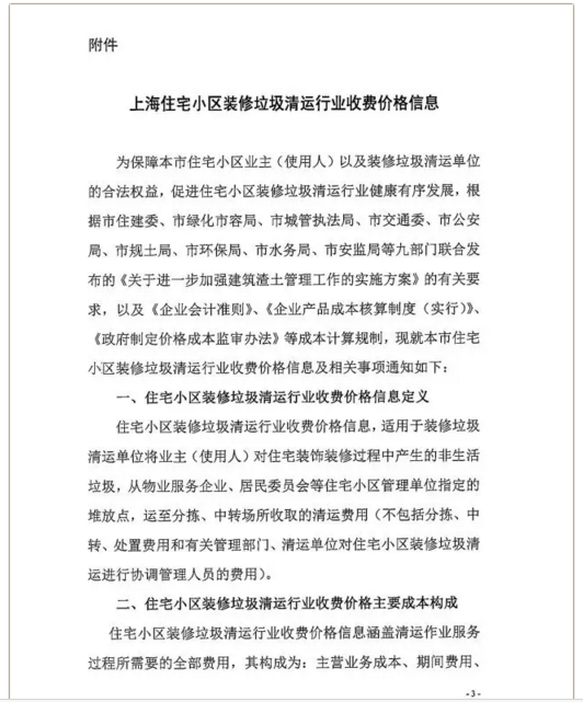 8月17日,《上海住宅小區(qū)裝修垃圾清運(yùn)行業(yè)收費(fèi)價格信息》(下稱《價格信息》)公布,《價格信息》明確了住宅小區(qū)裝修垃圾清運(yùn)行業(yè)收費(fèi)價格信息的定義,明確收費(fèi)價格主要成本構(gòu)成、計價方式、標(biāo)準(zhǔn)以及收費(fèi)主體。住宅小區(qū)裝修垃圾清運(yùn),根據(jù)首次和非首次裝飾裝修、基本面積等標(biāo)準(zhǔn)計價,此外,機(jī)關(guān)、企事業(yè)單位裝飾裝修垃圾清運(yùn)處置費(fèi)將根據(jù)清運(yùn)、分揀等環(huán)節(jié),按市場化、全成本要素,協(xié)商收取。