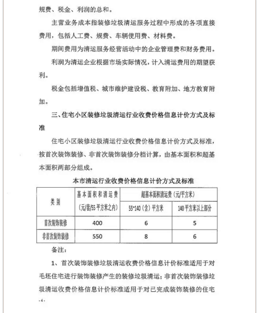 答1:早在1998年,上海市財政局曾發(fā)布過關(guān)于本市居民非生活垃圾行政事業(yè)型收費(fèi)的標(biāo)準(zhǔn)。其中規(guī)定,裝修裝飾垃圾清運(yùn)費(fèi)最高不超過每套400元。此后,相關(guān)區(qū)清運(yùn)單位將此作為參考標(biāo)準(zhǔn),曾實行過一室戶200元、兩室戶300元、三室戶400元的價格。2004年,財政部門將行政事業(yè)性收費(fèi)改為市場指導(dǎo)價。
