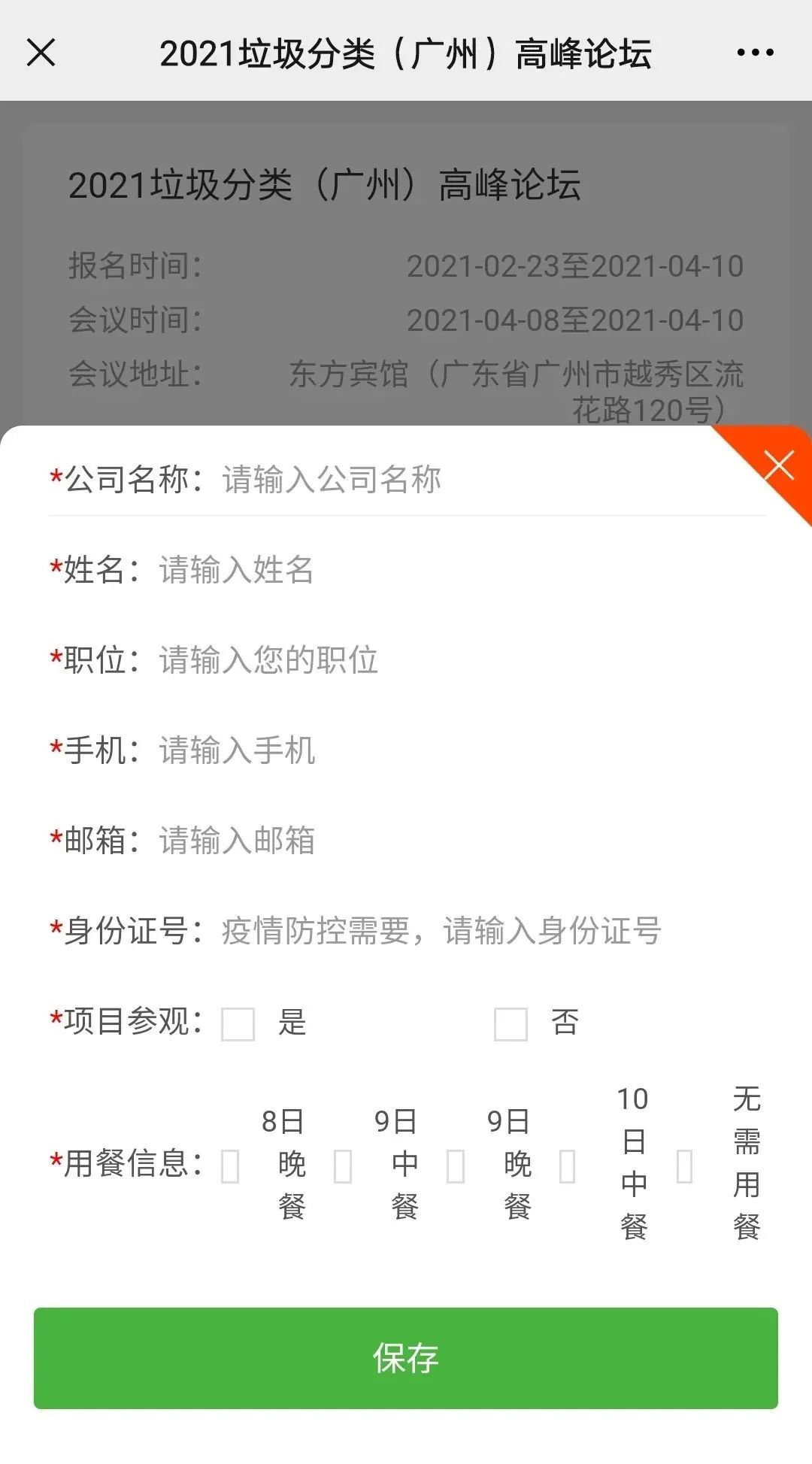 2021垃圾分類(廣州)高峰論壇正在火熱報名中關(guān)于論壇的報名流程細(xì)則很多朋友仍然存有不少疑惑為此,專委會做了詳細(xì)的梳理請各位參會代表仔細(xì)閱讀以下報名攻略。
