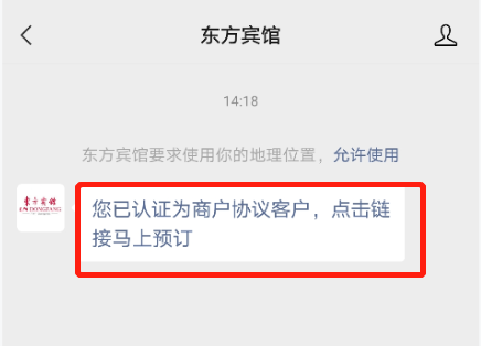2、關(guān)注公眾號后點擊對話框鏈接進(jìn)入酒店預(yù)定頁面;