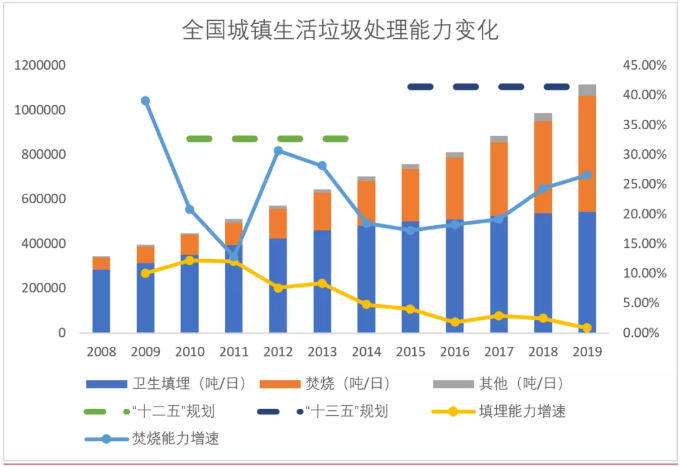 隨著我國經(jīng)濟(jì)的發(fā)展、城鎮(zhèn)化進(jìn)程的加速,城鎮(zhèn)規(guī)模和人口數(shù)量急劇膨脹,城市垃圾產(chǎn)生量激增,“垃圾圍城”已給眾多地方政府的城市管理工作帶來巨大壓力,尋找有效的解決辦法已迫在眉睫。近年來,在中央政策和資金的支持下,地方政府加大了對垃圾處理的投入,我國生活垃圾處理行業(yè)取得了快速的發(fā)展。國家發(fā)展與改革委、住房城鄉(xiāng)建設(shè)部發(fā)布的《“十三五”全國城鎮(zhèn)生活垃圾無害化處理設(shè)施建設(shè)規(guī)劃》(下稱“十三五”規(guī)劃)中制定了明確的生活垃圾無害化處理任務(wù)。同時制定了配套的投資計(jì)劃,“十三五”期間,全國城鎮(zhèn)生活垃圾無害化處理設(shè)施建設(shè)總投資預(yù)計(jì)2518.4億元,較“十二五”期間增長195%。