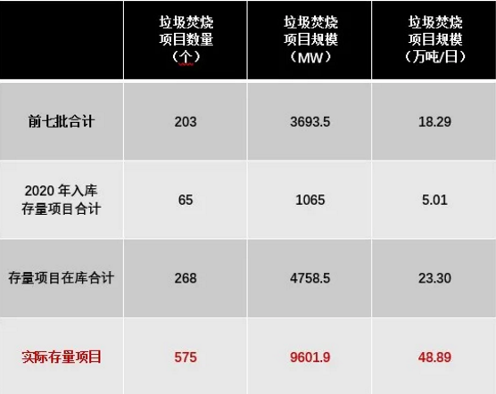 可再生能源發(fā)電項(xiàng)目“存量”、“新增”以2020年1月20日為界進(jìn)行劃分。存量項(xiàng)目中已在原有目錄內(nèi)的(前七批),直接進(jìn)入新目錄,并按原有規(guī)則進(jìn)行補(bǔ)貼。據(jù)E20研究院數(shù)據(jù)統(tǒng)計(jì),符合條件的存量項(xiàng)目合計(jì)575個,涉及處理能力48.89萬噸/日。而截至2020年底進(jìn)入目錄的共有268個項(xiàng)目,涉及處理能力23.30萬噸/日。