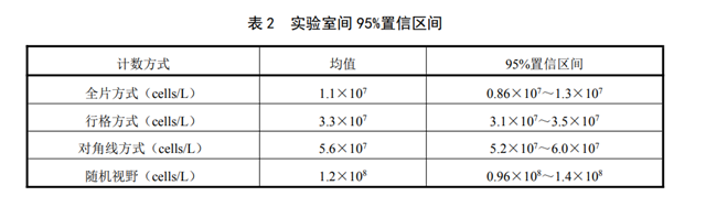 6家實(shí)驗(yàn)室分別用全片計(jì)數(shù)、行格計(jì)數(shù)、對角線計(jì)數(shù)和隨機(jī)視野計(jì)數(shù)對浮游植物密度為1×107 cells/L、3×107 cells/L、5×107 cells/L、1×108 cells/L 的實(shí)際樣品進(jìn)行了7次重復(fù)測定,實(shí)驗(yàn)室內(nèi)的相對標(biāo)準(zhǔn)偏差分別為2.4%——11%,2.9%——10%,2.7%——11%,4.8%——8.2%;實(shí)驗(yàn)室間相對標(biāo)準(zhǔn)偏差分別為22%、5.6%、7.1%、21%。計(jì)算測定結(jié)果對數(shù)值的 95%置信區(qū)間,再取反對數(shù)得到的實(shí)驗(yàn)室間95%置信區(qū)間見表2。