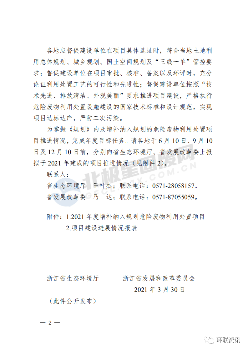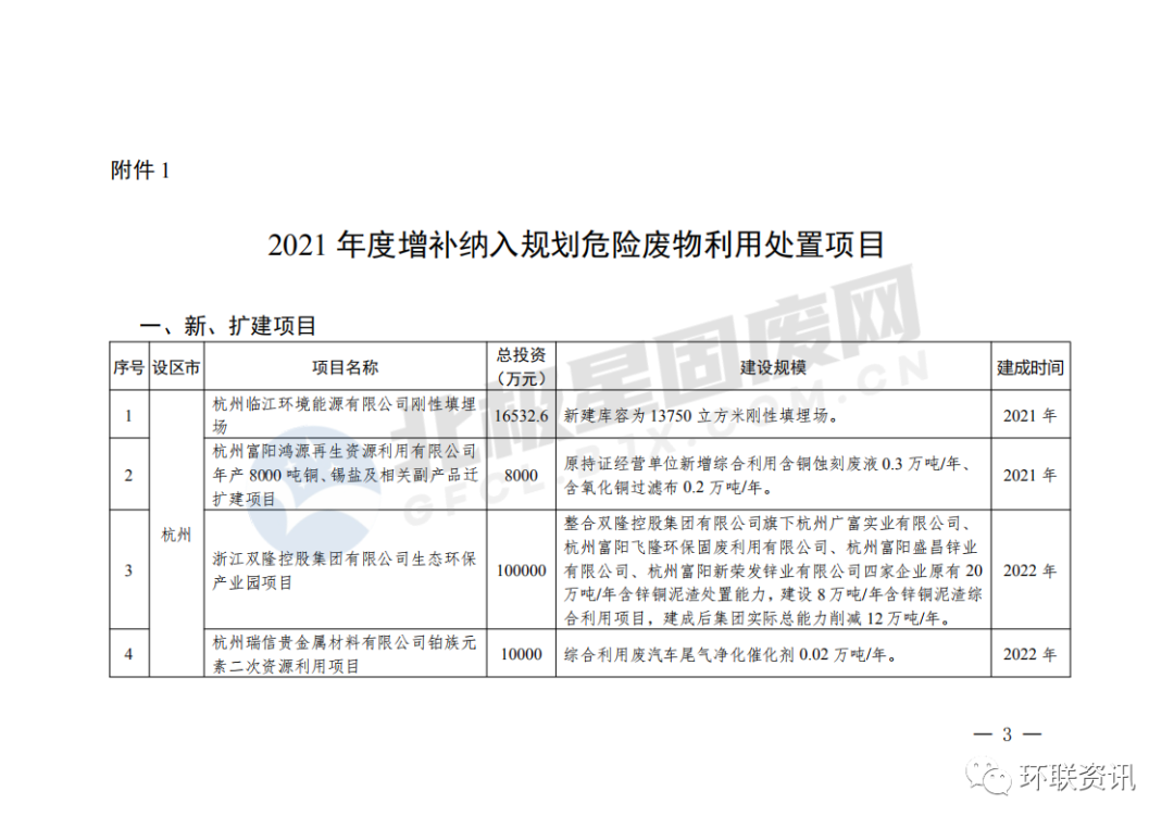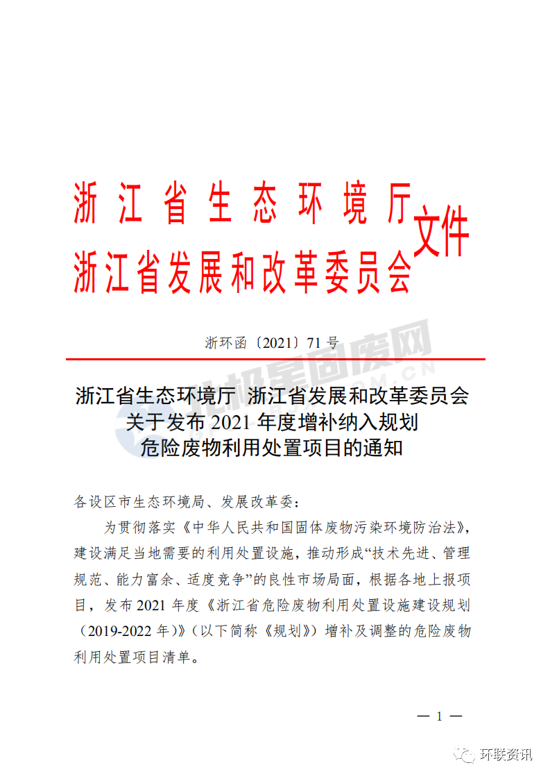 浙江省生態(tài)環(huán)境廳 浙江省發(fā)展和改革委員會關(guān)于發(fā)布2021年度增補納入規(guī)劃危險廢物利用處置項目的通知各設(shè)區(qū)市生態(tài)環(huán)境局、發(fā)展改革委:為貫徹落實《中華人民共和國固體廢物污染環(huán)境防治法》,建設(shè)滿足當(dāng)?shù)匦枰睦锰幹迷O(shè)施,推動形成“技術(shù)先進、管理規(guī)范、能力富余、適度競爭”的良性市場局面,根據(jù)各地上報項目,發(fā)布2021年度《浙江省危險廢物利用處置設(shè)施建設(shè)規(guī)劃(2019-2022年)》(以下簡稱《規(guī)劃》)增補及調(diào)整的危險廢物利用處置項目清單。