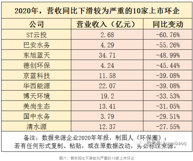 相比上述企業(yè)的出彩表現(xiàn),接下來圖六表格中的ST云投、巴安水務(wù)、東旭藍天、華西能源、國中水務(wù)、清水源等10家上市環(huán)企的表現(xiàn)則不盡如意,2020年營業(yè)收入下滑較為嚴(yán)重,降幅最大的前三分別是ST云投、巴安水務(wù)、東旭藍天。