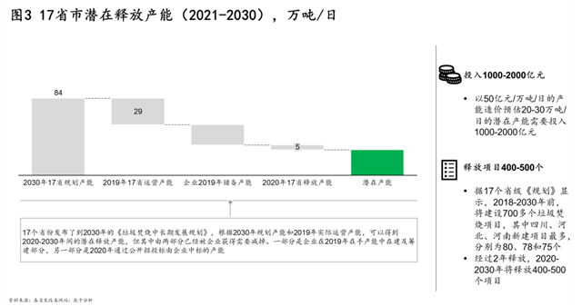 截至當(dāng)前,已有17個省市發(fā)布了垃圾焚燒中長期發(fā)展規(guī)劃,根據(jù)這些省市到2030年的相關(guān)產(chǎn)能規(guī)劃,未來10年仍將有20~30萬噸/日的新增產(chǎn)能,釋放項目400~500個,投資規(guī)模1000~2000億元(見圖3)。而如果放眼全國,這三個數(shù)字只會更大。這一體量不容小覷,相當(dāng)于當(dāng)前行業(yè)排名第2-9位企業(yè)的在手產(chǎn)能之和,釋放的項目數(shù)量則相當(dāng)于過去3年的全部開標(biāo)項目數(shù)量。