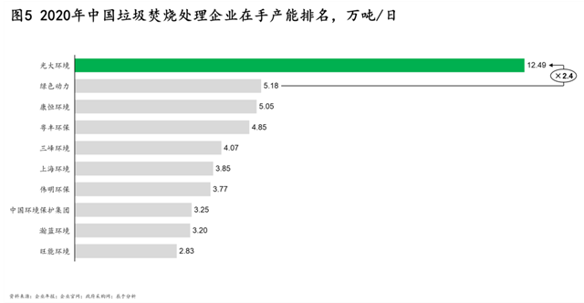 當(dāng)前,我國垃圾焚燒處理市場呈現(xiàn)“一枝獨秀”的競爭格局:處于領(lǐng)先地位的光大環(huán)境,連續(xù)多年排名第一,截至2020年底,在手產(chǎn)能[2]12.49萬噸/日,是排在第二位的綠色動力5.18萬噸/日的2.4倍,優(yōu)勢十分明顯,而排在第2-9位的企業(yè),在手產(chǎn)能大多在3-5萬噸/日左右,實力相當(dāng),差距不大(見圖5)。