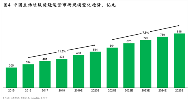 回顧“十三五”,伴隨垃圾焚燒項目投建的突飛猛進,運營市場同樣快速增長,期間年復(fù)合增長率11.3%,到2020年運營規(guī)模達(dá)到544億元。展望“十四五”,在人均垃圾產(chǎn)生量以及垃圾焚燒比例持續(xù)上升的有利驅(qū)動下,我們預(yù)計垃圾焚燒運營規(guī)模仍將保持7.9%的年復(fù)合增速,到2025年達(dá)到818億元(見圖4)。隨著行業(yè)監(jiān)管日趨嚴(yán)格,部分企業(yè)包括政府投資項目在技術(shù)、運營方面能力不足問題凸顯,這為行業(yè)內(nèi)優(yōu)質(zhì)企業(yè)在運營管理對外服務(wù)提供了“輕資產(chǎn)化”的廣闊商機。