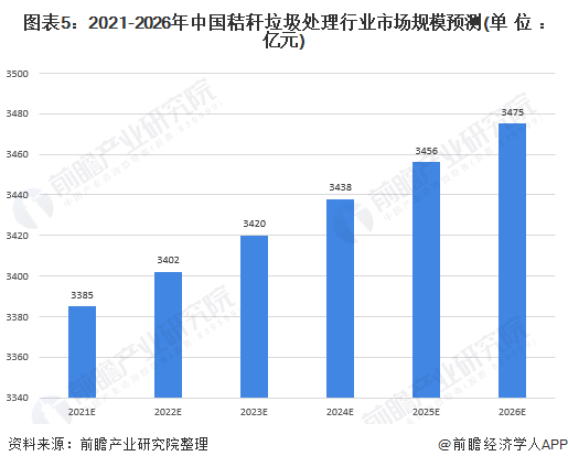 隨著我國秸稈垃圾處理的利用率的不斷提升及技術(shù)水平的不斷進(jìn)步,前瞻認(rèn)為,未來秸稈垃圾處理行業(yè)的市場規(guī)模將保持一個穩(wěn)定增長的態(tài)勢,預(yù)計到2026年,整個行業(yè)的市場規(guī)模將達(dá)到3475億元。