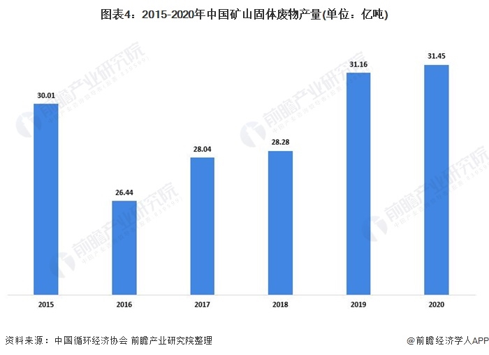 礦山固體廢物棄置在環(huán)境系統(tǒng)的有害廢物(包含砷和鎘等有害元素)會(huì)對(duì)人身產(chǎn)生直接危害。2020年中國(guó)礦上固體廢物產(chǎn)量為31.45億噸。在不斷加強(qiáng)的政策,我國(guó)礦上固體廢物的處理量逐年上升,2020年,我國(guó)礦上固體廢物的處理量為14.79億噸。
