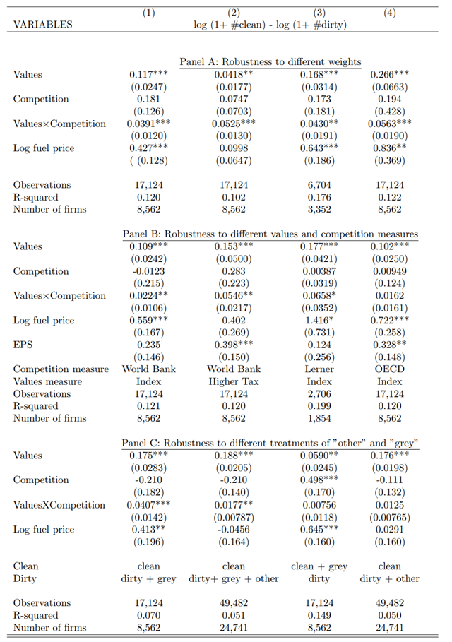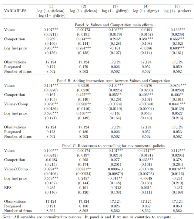 第一,本文構建了一個簡單的模型,并收集了企業(yè)級汽車行業(yè)、國民環(huán)境態(tài)度(綠色偏好)和市場競爭程度的數(shù)據。我們發(fā)現(xiàn):綠色偏好及其與市場競爭的相互作用都對企業(yè)重視綠色創(chuàng)新的機率有顯著的積極影響。