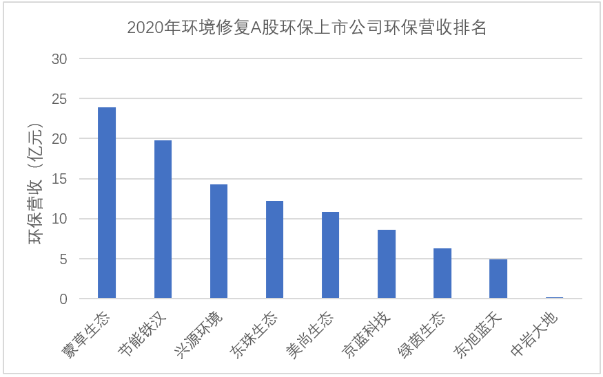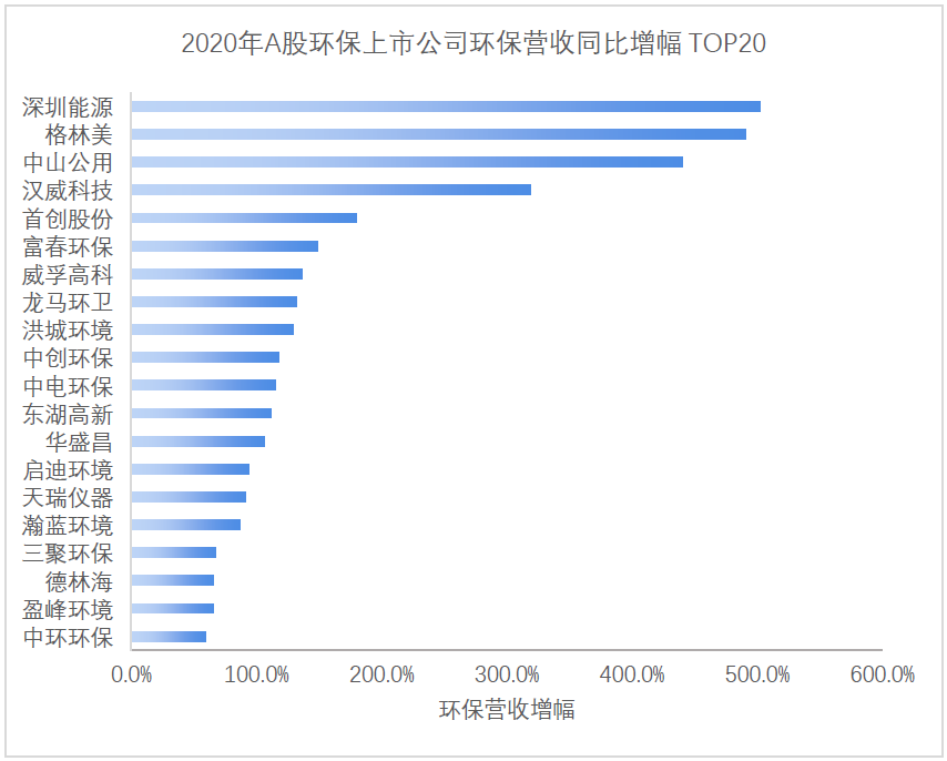 A股環(huán)保上市公司環(huán)保營(yíng)收方面:2020年,150家上市公司環(huán)保營(yíng)收總額3341.4億元,同比增長(zhǎng)25.3%。其中,101家(占比67.3%)環(huán)保營(yíng)收實(shí)現(xiàn)同比增長(zhǎng),最高增幅約達(dá)1171.1%;49家(占比32.7%)同比下滑,最高跌幅約達(dá)-89.8%。環(huán)保營(yíng)收規(guī)模居首位的中國(guó)天楹,得益于重大并購(gòu)后境內(nèi)業(yè)務(wù)和境外業(yè)務(wù)的雙雙增長(zhǎng);首創(chuàng)股份污水處理、供水服務(wù)、固廢處理業(yè)務(wù)營(yíng)收增長(zhǎng)均超過(guò)30%,環(huán)保營(yíng)收規(guī)模進(jìn)一步擴(kuò)大。營(yíng)收增幅排名靠前的企業(yè)中,深圳能源營(yíng)收總額與上年基本持平,環(huán)保板塊營(yíng)收增速明顯且毛利率提升,在其他主營(yíng)業(yè)務(wù)受到?jīng)_擊的情況下,環(huán)保業(yè)務(wù)成為企業(yè)重要新的增長(zhǎng)極。(注:因港股環(huán)保上市公司環(huán)保營(yíng)收難以準(zhǔn)確從總營(yíng)收中拆分,未計(jì)入統(tǒng)計(jì)。)2020年A股環(huán)保上市公司環(huán)保營(yíng)收TOP20