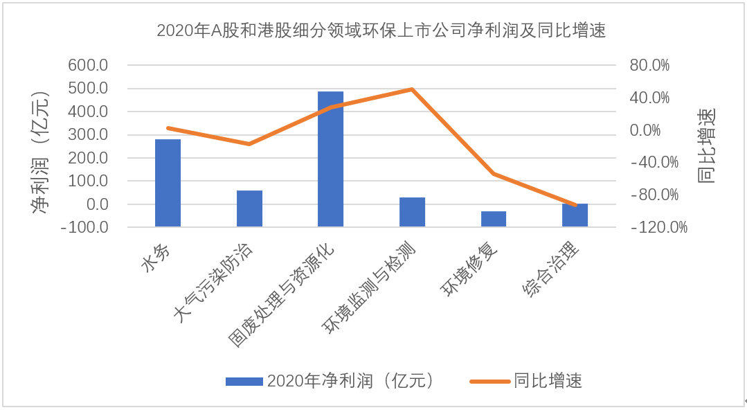 2020年,179家環(huán)保上市公司共實(shí)現(xiàn)凈利潤(rùn)總額(包含非環(huán)保業(yè)務(wù)凈利潤(rùn),如雅居樂(lè)集團(tuán)、金隅集團(tuán)等)828.7億元,同比增長(zhǎng)6.2%。其中,106家(占比59.2%)凈利潤(rùn)同比增長(zhǎng),最高增幅約達(dá)622.3%,73家(占比40.8%)凈利潤(rùn)同比下滑,最高跌幅約達(dá)-7778.9%,28家(占比15.6%)出現(xiàn)虧損(凈利潤(rùn)為負(fù))。部分凈利潤(rùn)增幅較大的企業(yè)是扭虧為盈,如漢威科技、中創(chuàng)環(huán)保、節(jié)能鐵漢等,其中鐵漢生態(tài)在易主中節(jié)能之后,更名為節(jié)能鐵漢,進(jìn)行戰(zhàn)略調(diào)整,報(bào)告期內(nèi)良性退出17個(gè)PPP項(xiàng)目,并重新實(shí)現(xiàn)盈利。細(xì)分領(lǐng)域環(huán)保上市公司2020年度盤(pán)點(diǎn)發(fā)現(xiàn)各細(xì)分領(lǐng)域中,營(yíng)收總額方面,固廢規(guī)模及增速均居首位;凈利潤(rùn)方面,固廢領(lǐng)域規(guī)模最大,環(huán)境監(jiān)測(cè)與檢測(cè)領(lǐng)域增長(zhǎng)最快。(注:數(shù)據(jù)基于環(huán)保上市公司2020年年報(bào)所披露信息,本盤(pán)點(diǎn)中將同時(shí)側(cè)重多業(yè)務(wù)領(lǐng)域而未能劃入水務(wù)、大氣污染防治、固廢處理與資源化、環(huán)境監(jiān)測(cè)與檢測(cè)、環(huán)境修復(fù)5個(gè)細(xì)分領(lǐng)域的環(huán)保上市公司暫列入“綜合治理領(lǐng)域”)