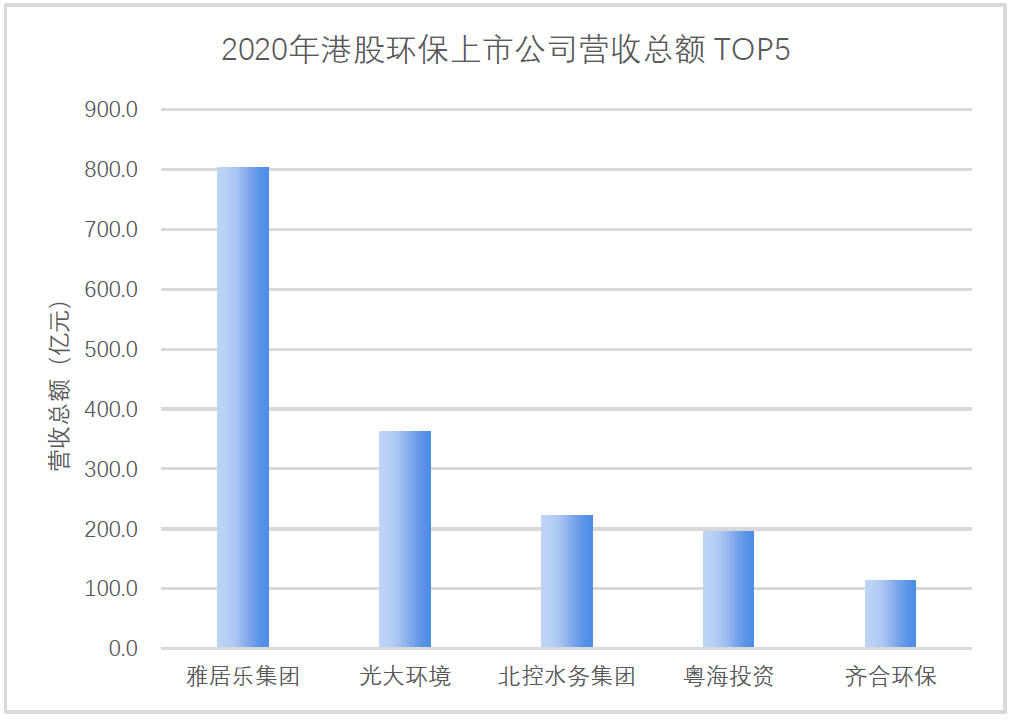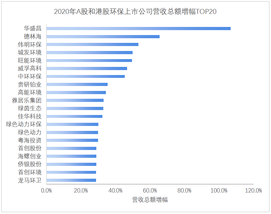 注: 數(shù)據(jù)來(lái)源于Wind數(shù)據(jù)庫(kù),個(gè)別A股環(huán)保上市公司的環(huán)保營(yíng)收難以準(zhǔn)確確定,實(shí)際情況以上市公司發(fā)布為準(zhǔn)。A股和港股環(huán)保上市公司營(yíng)收總額方面:2020年179家環(huán)保上市公司共實(shí)現(xiàn)營(yíng)收總額10717.4億元,同比增長(zhǎng)7.6%,營(yíng)收總額規(guī)模呈現(xiàn)擴(kuò)張態(tài)勢(shì)。其中,120家營(yíng)收(占比67.0%)實(shí)現(xiàn)同比增長(zhǎng),最高增幅106.8%,59家(占比33.0%)營(yíng)收同比下滑,最高跌幅-89.8%。其中,增幅最高的華盛昌,主要得益于防疫相關(guān)檢測(cè)設(shè)備銷(xiāo)售的增長(zhǎng);緊隨其后的德林海營(yíng)收的快速增長(zhǎng)主要得益于藍(lán)藻治理業(yè)務(wù)的增長(zhǎng);偉明環(huán)??偁I(yíng)收整體增幅也超過(guò)50%,其垃圾焚燒設(shè)備、EPC及服務(wù)業(yè)務(wù)營(yíng)收增長(zhǎng)193.02%,垃圾清運(yùn)業(yè)務(wù)營(yíng)收增長(zhǎng)超過(guò)90%。
