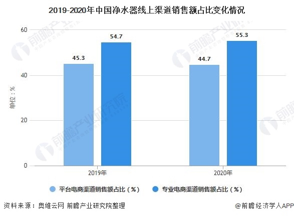 目前凈水器的線上銷售渠道主要分為平臺(tái)電商和專業(yè)電商兩大類,2019年凈水器通過(guò)平臺(tái)電商渠道銷售額占比為45.3%,通過(guò)專業(yè)電商渠道銷售額占比為54.7%;2020年平臺(tái)電商渠道銷售額占比進(jìn)一步下滑,2020年凈水器通過(guò)平臺(tái)電商銷售額占比為44.7%,通過(guò)專業(yè)電商銷售額占比上升為55.3%。