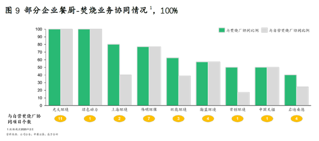 在垃圾分類全面推行的大背景下,這些大型固廢企業(yè)正利用協(xié)同優(yōu)勢降維打擊(見圖9)。一方面,垃圾焚燒主業(yè)帶給這些企業(yè)資金和政府資源雙重優(yōu)勢;另一方面,協(xié)同處置帶來降本增效,可以幫助這些企業(yè)降低財務壓力:在收入端,協(xié)同優(yōu)勢在于餐廚沼渣余電上網(wǎng);而在成本端,除可節(jié)約土建、人工等成本外,干濕垃圾處置的發(fā)電設備、除臭系統(tǒng)、滲濾液處理系統(tǒng)、蒸汽供熱系統(tǒng)等也可共用,從而降低折舊攤銷成本。