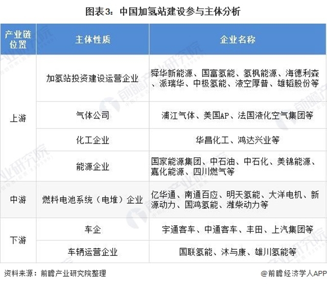 近年氫能行業(yè)發(fā)展逐漸加快,加氫站建設(shè)參與主體呈現(xiàn)多樣化趨勢,氫能產(chǎn)業(yè)各環(huán)節(jié)的企業(yè)都有參與加氫站建設(shè)的案例,包括上游的能源、化工和氣體公司以及專業(yè)的加氫站建設(shè)運(yùn)營商和設(shè)備供應(yīng)商,中游的燃料電池電堆和系統(tǒng)企業(yè),下游的整車企業(yè)和車輛運(yùn)營企業(yè)。