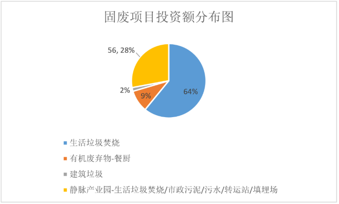 2020年,河南18個(gè)主要城市共中標(biāo)固廢項(xiàng)目19個(gè),總投資額64.32億。共包含:10個(gè)生活垃圾焚燒項(xiàng)目(含綜合處理項(xiàng)目3個(gè))、6個(gè)有機(jī)廢棄物項(xiàng)目(含綜合處理項(xiàng)目2個(gè))、4個(gè)建筑垃圾、1個(gè)危險(xiǎn)廢物項(xiàng)目、1個(gè)靜脈產(chǎn)業(yè)園。從2020年河南固廢市場(chǎng)中標(biāo)情況來看,生活垃圾焚燒項(xiàng)目投資額最大,占整個(gè)固廢市場(chǎng)的64%,具體分布情況,如圖2所示: