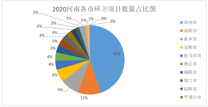 圖3:2020年河南各市環(huán)衛(wèi)市場(chǎng)化項(xiàng)目數(shù)量占比情況(統(tǒng)計(jì)數(shù)據(jù)來源于:E標(biāo)通)
