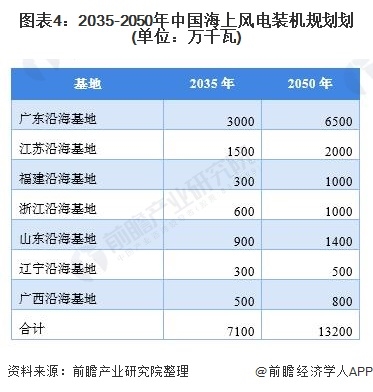 2020年我國風電新增并網(wǎng)裝機達到7167萬千瓦,其中海上風電新增裝機達到306萬千瓦,截至2020年底,我國海上風電累計裝機約900萬千瓦。據(jù)《中國“十四五”電力發(fā)展規(guī)劃研究》,我國將主要在廣東、江蘇、福建、浙江、山東、遼寧和廣西沿海等地區(qū)開發(fā)海上風電,重點開發(fā)7個大型海上風電基地,大型基地2035年、2050年總裝機規(guī)模分別達到7100萬、1.32億千瓦。
