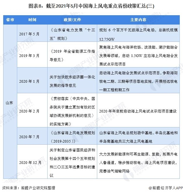 對于沿海重點省市,其海上風電資源豐富,發(fā)展?jié)摿Υ?,海上風力發(fā)電將是其能源產(chǎn)業(yè)的重點之一,大力發(fā)展海上風電是推進能源結(jié)構調(diào)整、實現(xiàn)高質(zhì)量發(fā)展的重要抓手,是建設海洋強省的重要舉措。截至2021年5月,我國海上風電重點省份的政策匯總?cè)缦拢?br />