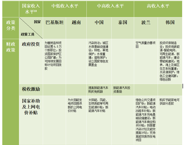 總結(jié)而言,中等偏下收入的國(guó)家更多地依賴生態(tài)環(huán)保相關(guān)項(xiàng)目來(lái)帶動(dòng)就業(yè)。而中等偏上收入和高收入國(guó)家將財(cái)政政策輻射到更多領(lǐng)域(如新能源汽車、建筑節(jié)能、能效)且利用了更豐富的政策工具(如財(cái)政政策上的稅收優(yōu)惠、補(bǔ)貼,配套的貨幣政策等)。