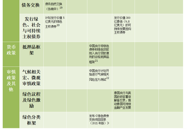 兩個(gè)中等偏上收入的國(guó)家,在生態(tài)基礎(chǔ)設(shè)施和污染治理的基礎(chǔ)上,將財(cái)政刺激更多地傾斜于可再生能源發(fā)展和新能源車補(bǔ)貼。對(duì)新能源汽車行業(yè)的支持同時(shí)也包括了在購(gòu)買、生產(chǎn)和投資方面的稅收優(yōu)惠。在貨幣政策和金融監(jiān)管方面,中國(guó)央行將綠色債券和綠色貸款納入央行貸款便利的合格抵押品框架,計(jì)劃開(kāi)始進(jìn)行氣候風(fēng)險(xiǎn)壓力測(cè)試,同時(shí)發(fā)布了《綠色債券支持項(xiàng)目目錄(2021年版)》對(duì)綠色債券市場(chǎng)進(jìn)行了進(jìn)一步規(guī)范和指導(dǎo)。