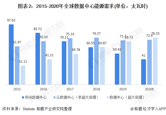 整體來看,全球數(shù)據(jù)中心能源需求有所下降,2016-2018年在195太瓦時(shí)以上,2019年下降為191.84太瓦時(shí)。其中,傳統(tǒng)數(shù)據(jù)中心的能源需求已從2015年的約97.62太瓦時(shí)減少到2019年的約50太瓦時(shí),說明數(shù)據(jù)中心產(chǎn)業(yè)能源消耗在逐漸減少,數(shù)據(jù)中心綠色化和低碳化趨勢明顯。