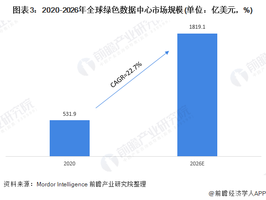 在此背景下,全球綠色數(shù)據(jù)中心市場將持續(xù)發(fā)展,2020年市場規(guī)模為531.9億美元,2026年綠色數(shù)據(jù)中心市場規(guī)模有望達(dá)到1819.1億美元,2020-2026年年復(fù)合增長率超過22%。