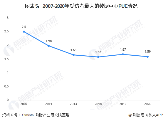PUE(Power Usage Effectiveness)是衡量數(shù)據(jù)中心運(yùn)行效率的指標(biāo),其越接近于1,代表數(shù)據(jù)中心對于電能的利用越有效率。一項(xiàng)全球調(diào)研數(shù)據(jù)顯示,到2020年,受訪者最大的數(shù)據(jù)中心內(nèi)的平均年電力使用效率(PUE)比為1.59,較往年大幅下降。目前,全球數(shù)據(jù)中心行業(yè)平均PUE水平在1.5左右。