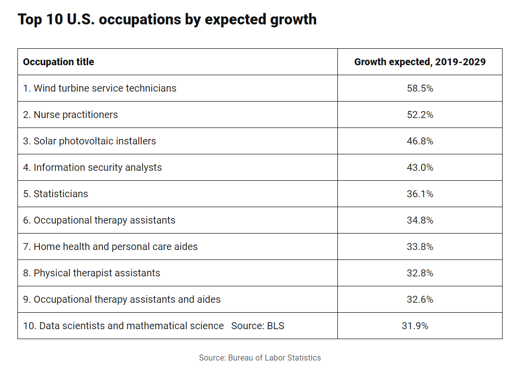 按預(yù)期增長(zhǎng)分列的美國(guó)前10大職業(yè)(2019-2029年預(yù)期崗位增長(zhǎng)率):